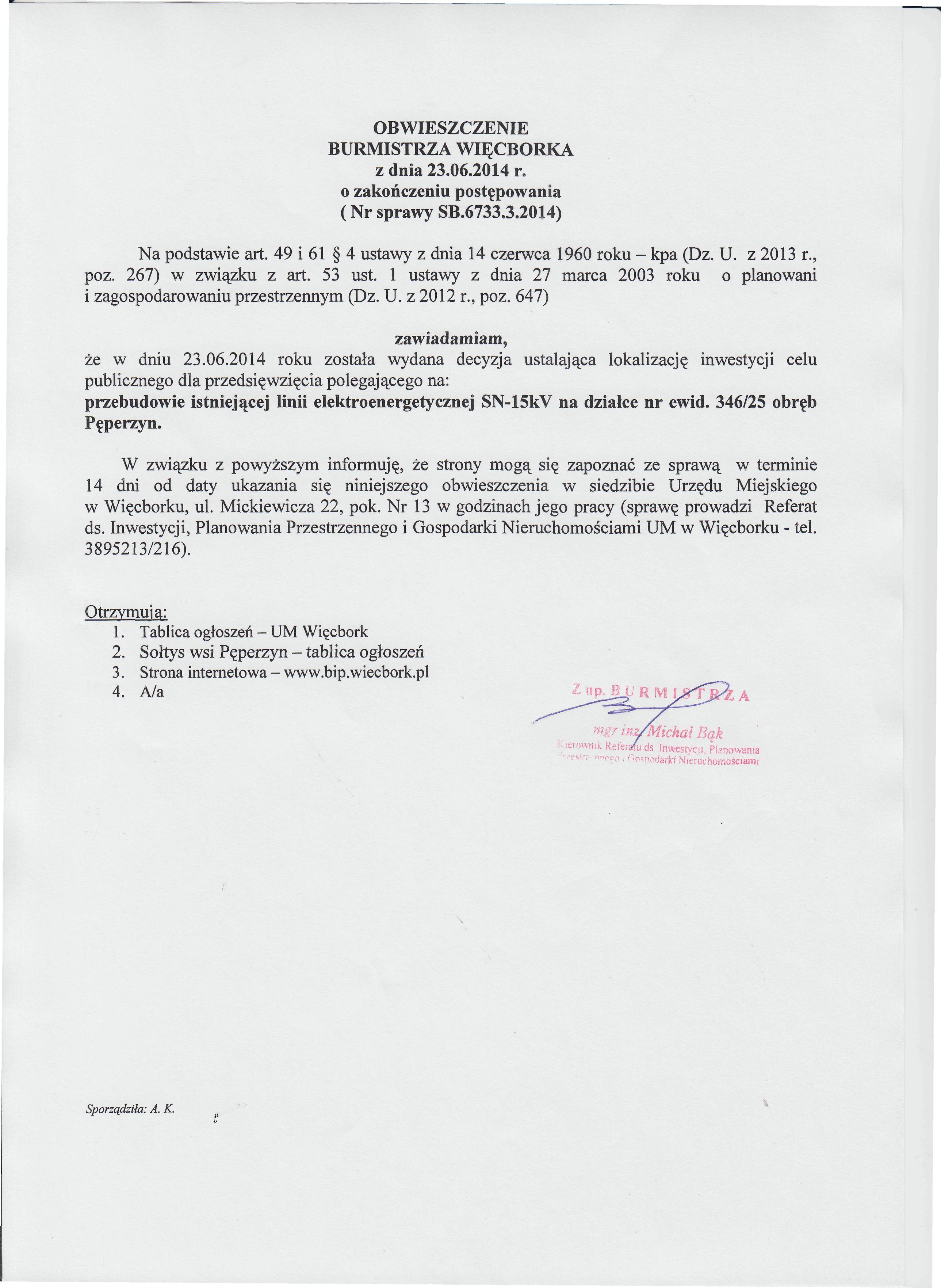 Obwieszczenie Burmistrza Więcborka z dnia 23.06.2014 r. o zakończeniu postępowania w sprawie wydania decyzji o ustaleniu lokalizacji ...przebudowie istniejącej linii elektroenergetycznej SN-15kV na działce nr 346/25