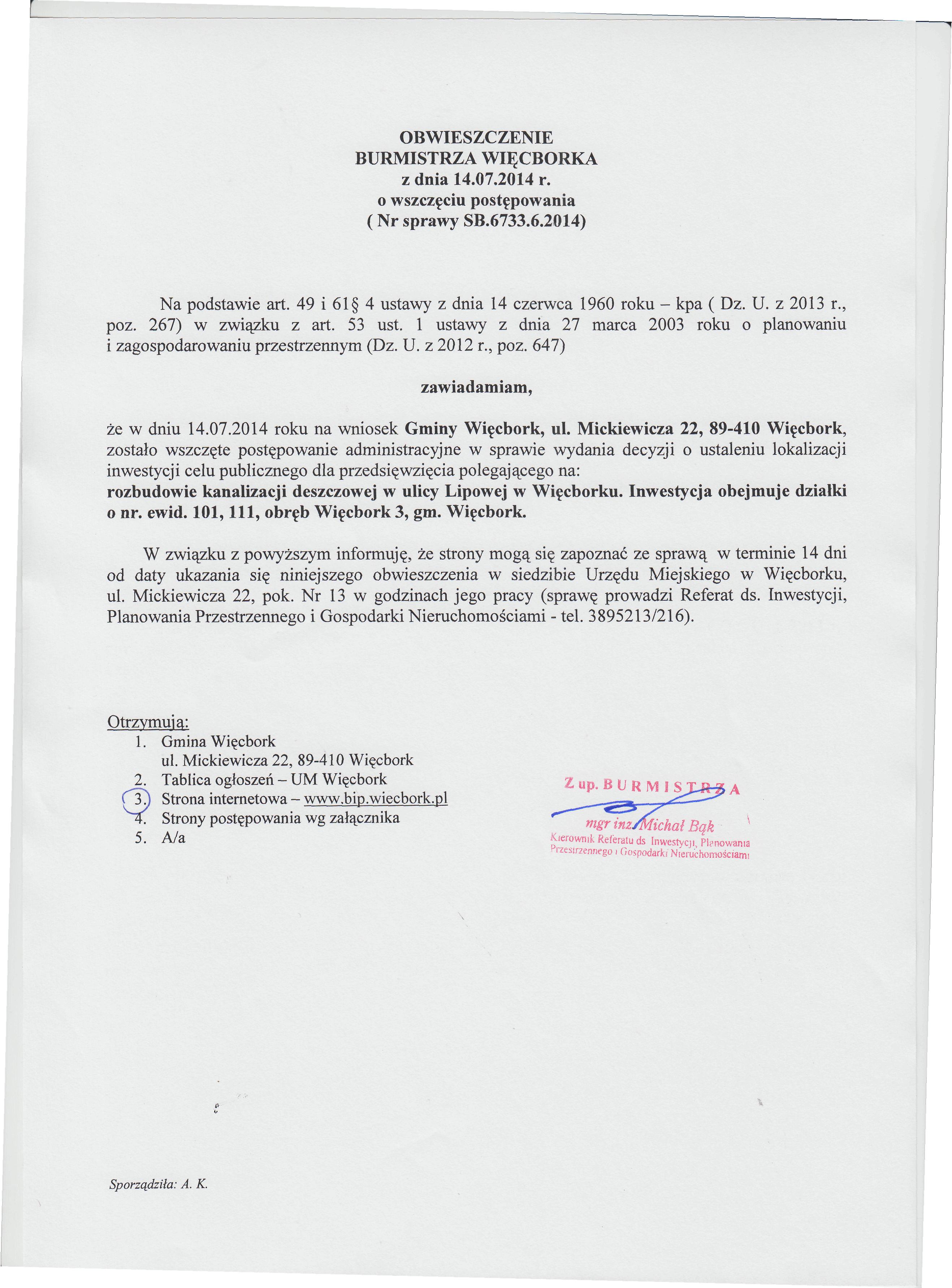 Obwieszczenie Burmistrza Więcborka z dnia 14.07.2014 r. o wszczęciu postępowania w sprawie wydania decyzji o ustaleniu lokalizacji inwestycji celu publicznego ...rozbudowa kanalizacji deszczowej w ulicy Lipowej w Więcborku
