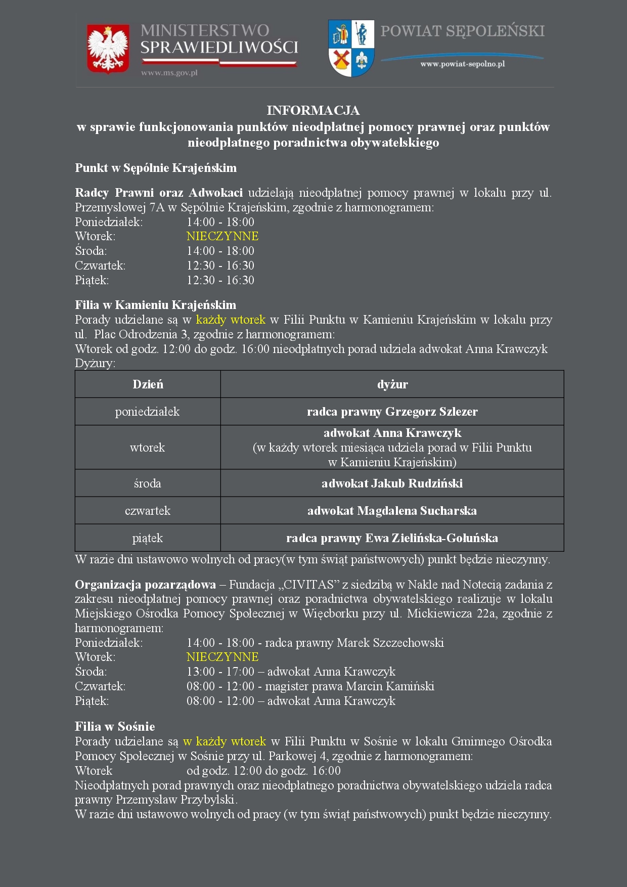- Punkt w Sępólnie Krajeńskim i Filia Punktu w Kamieniu Krajeńskim – radca prawny Karol Czerkawski, adwokat Anna Krawczyk, adwokat Jakub Rudziński
