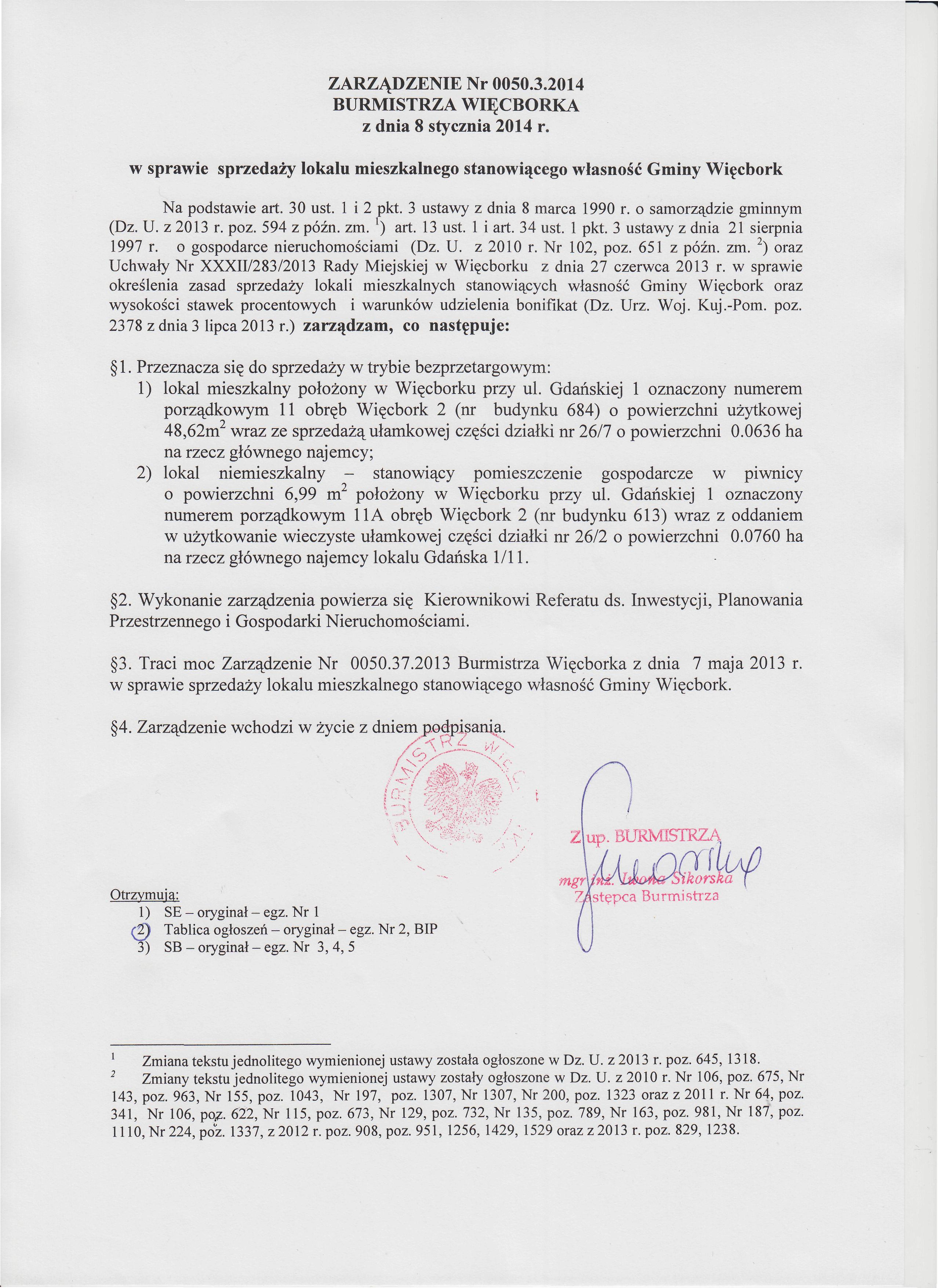 - Podstawa prawna wydania Na podstawie art. 30 ust. 1 i 2 pkt. 3 ustawy z dnia 8 marca 1990 r. o samorządzie gminnym (Dz. U. z 2013 r. poz. 594 z późn. zm. ogłoszonymi w Dz. U. z 2013 r. poz. 645, 1318) art. 13 ust. 1 i art. 34 ust. 1 pkt. 3 ustawy z dnia 21 sierpnia 1997 r. o gospodarce nieruchomościami (Dz. U. z 2010 r. Nr 102, poz. 651 z późn. zm. ogłoszonymi w Dz. U. z 2010 r. Nr 106, poz. 675, Nr 143, poz. 963, Nr 155, poz. 1043, Nr 197, poz. 1307, Nr 1307, Nr 200, poz. 1323 oraz z 2011 r. Nr 64, poz. 341, Nr 106, poz. 622, Nr 115, poz. 673, Nr 129, poz. 732, Nr 135, poz. 789, Nr 163, poz. 981, Nr 187, poz. 1110, Nr 224, poz. 1337, z 2012 r. poz. 908, poz. 951, 1256, 1429, 1529 oraz z 2013 r. poz. 829, 1238) oraz Uchwały Nr XXXII/283/2013 Rady Miejskiej w Więcborku z dnia 27 czerwca 2013 r. w sprawie określenia zasad sprzedaży lokali mieszkalnych stanowiących własność Gminy Więcbork oraz wysokości stawek procentowych i warunków udzienenia bonifikat (Dz. Urz. Woj. Kuj-Pom. poz. 2378 z dnia 3 lipca 2013 r.)