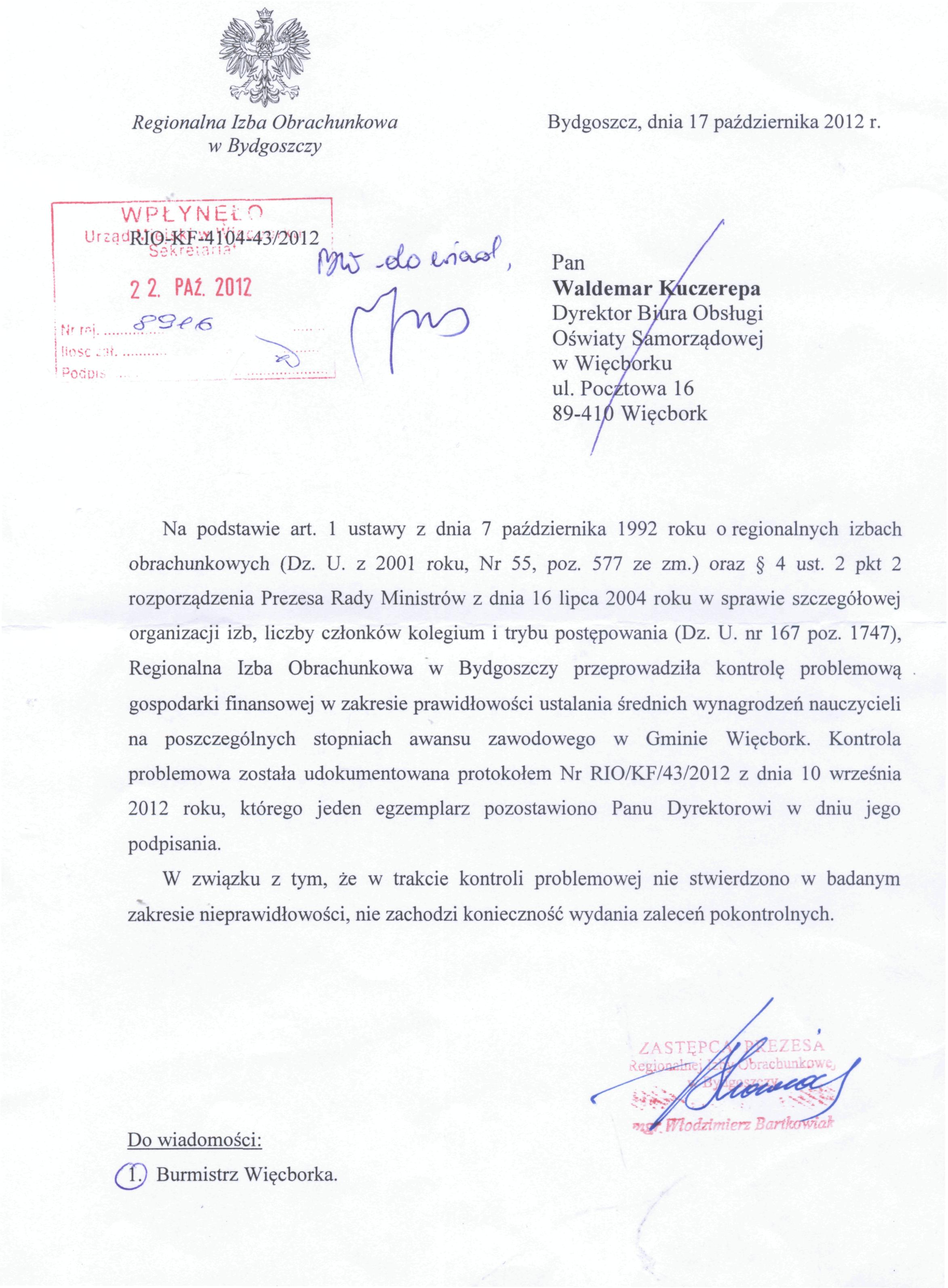 | Protokół z kontroli problemowej przeprowadzonej przez inspektorów Regionalnej Izby Obrachunkowej w Bydgoszczy w Biurze Obsługi Oświaty Samorządowej w Wiecborku - 04.09.2012 r. - 07.09.2012 r. | dodany: 11:04, 14.03.2016 | przez: Ewa Kiestrzyn-Kobus | |