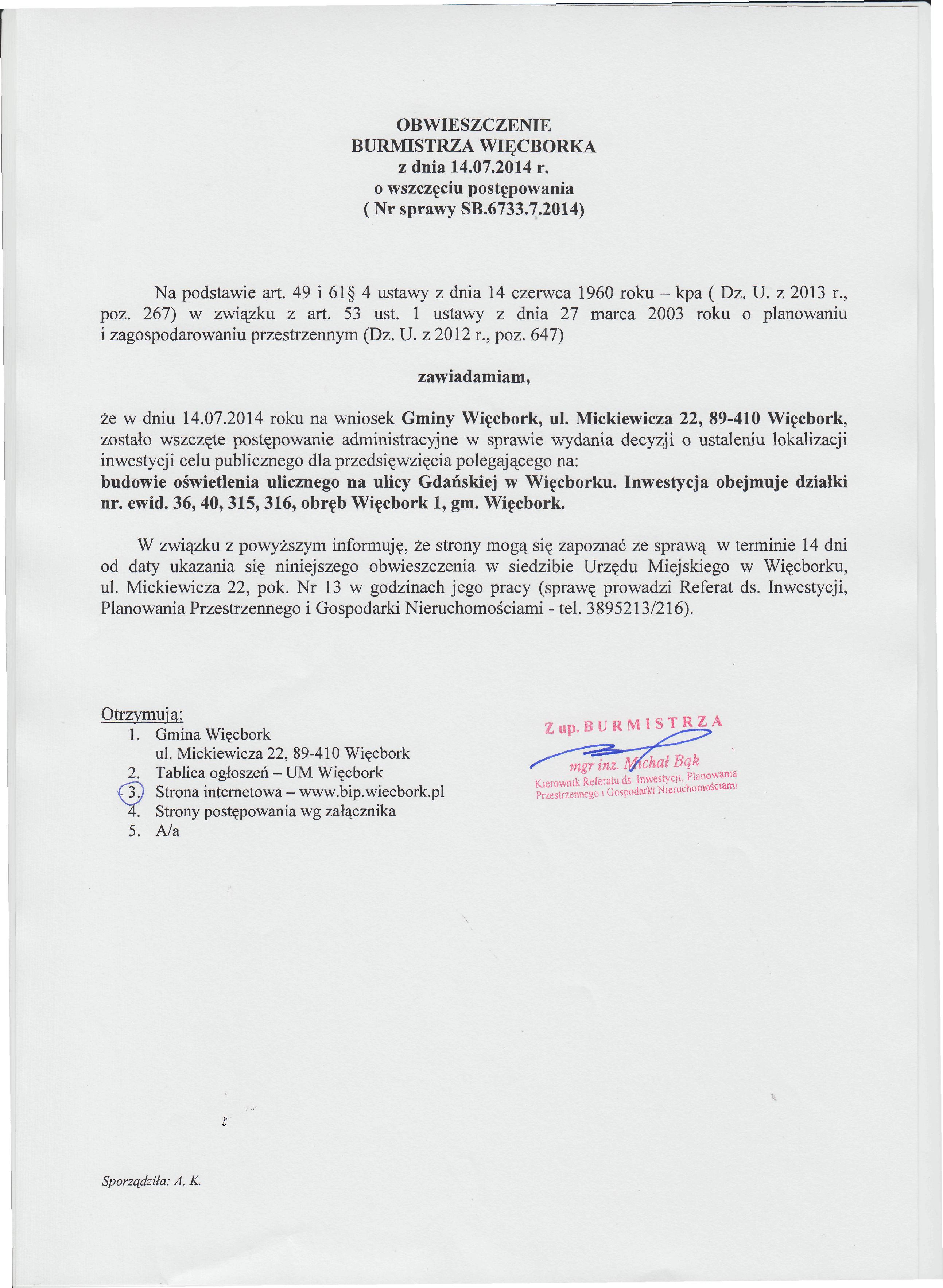 | utworzono: | data: 14:03, 24.02.2016 | przez: Ewa Kiestrzyn-Kobus | Obwieszczenie Burmistrza Więcborka z dnia 14.07.2014 r. o wszczęciu postępowania w sprawie wydania decyzji o ustaleniu lokalizacji inwestycji celu publicznego ... budowa oświetlenia ulicznego na ulicy Gdańskiej w Więcborku |