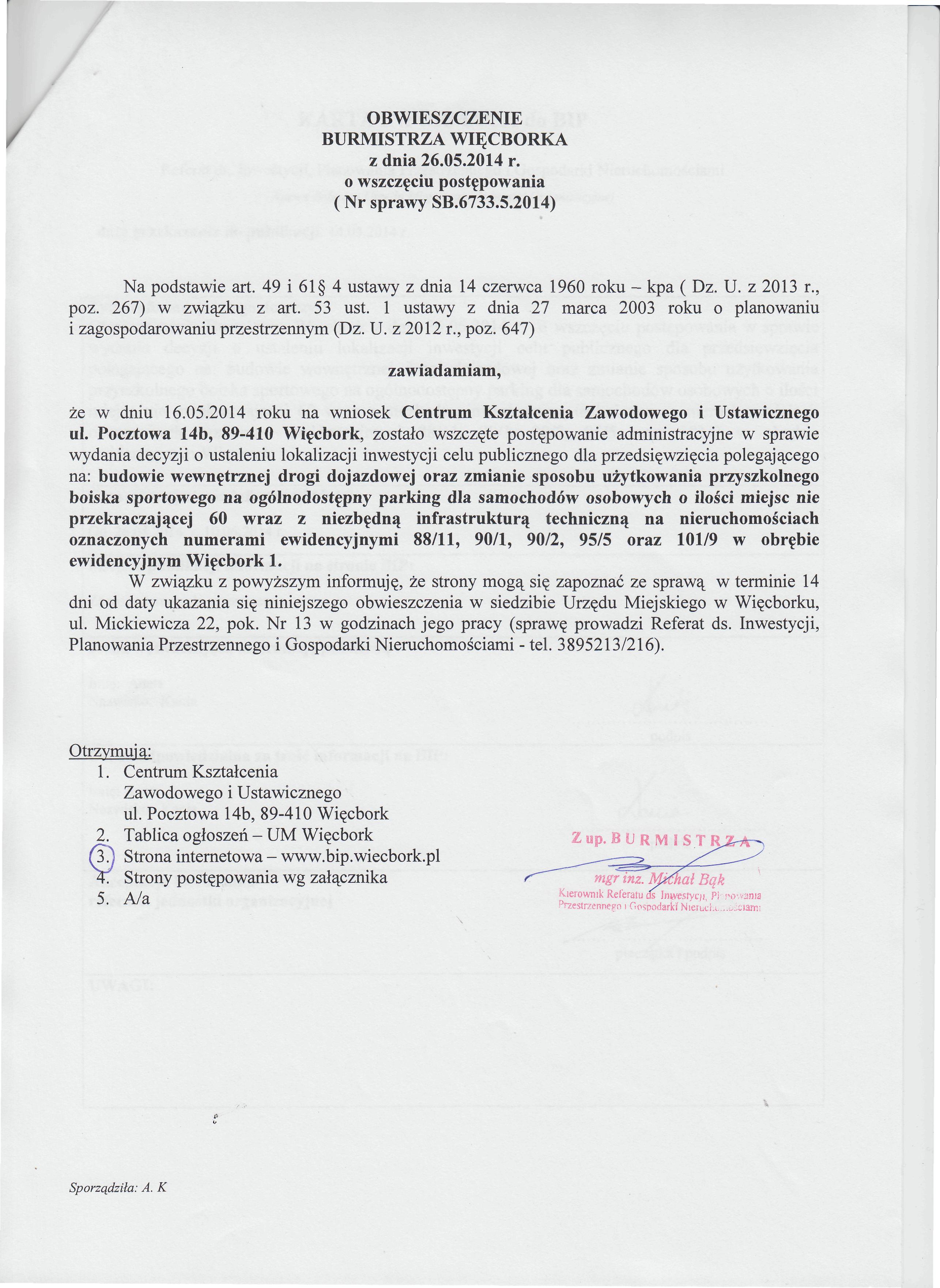 Obwieszczenie Burmistrza Więcborka z dnia 26.05.2014 r. o wszczeciu postępowania w sprawie wydania decyzji o ustaleniu celu publicznego … – budowa wewnętrznej drogi dojazdowej …