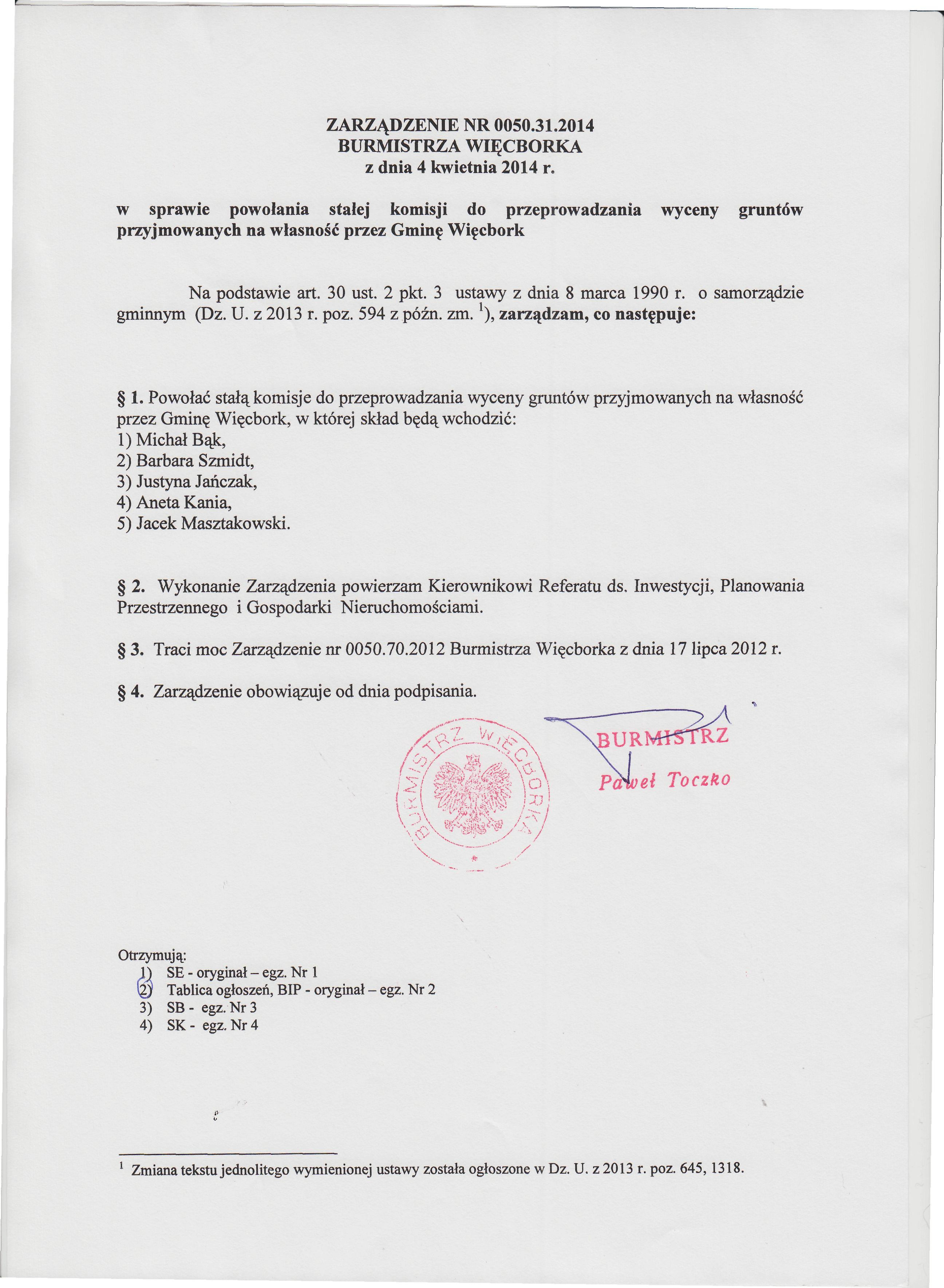 | utworzono: | data: 12:01, 04.04.2014 | przez: Ewa Kiestrzyn-Kobus | ZARZĄDZENIE NR 0050.31.2014 BURMISTRZA WIĘCBORKA z dnia 4 kwietnia 2014 r. w sprawie powołania stałej komisji do przeprowadzenia wyceny gruntów przyjmowanych na własność przez gminę Więcbork. |