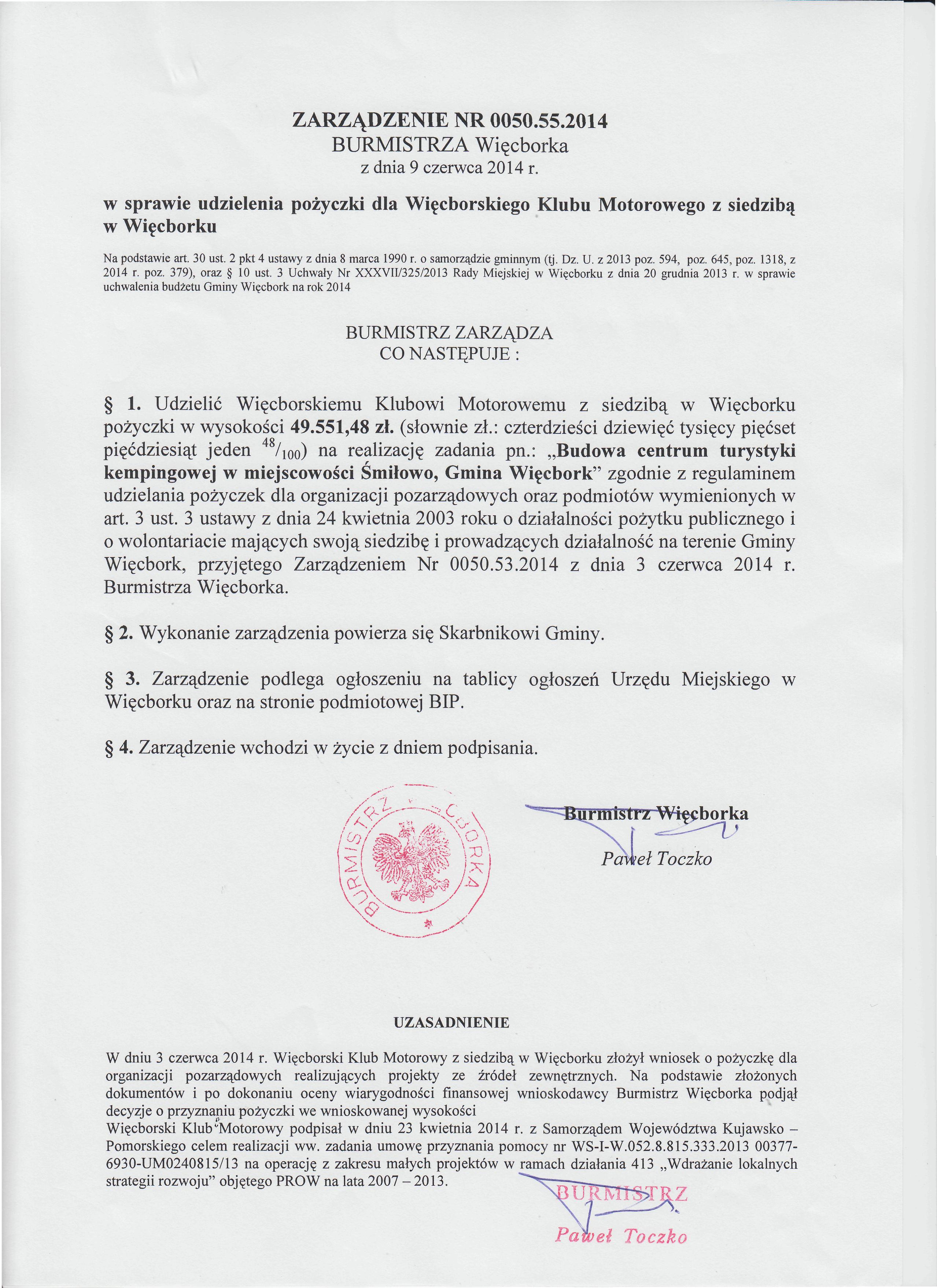 | utworzono: | data: 14:17, 20.06.2014 | przez: Ewa Kiestrzyn-Kobus | ZARZĄDZENIE NR 0050.55.2014 BURMISTRZA WIĘCBORKA z dnia 9 czerwca 2014 r. w sprawie udzielenia pożyczki dla Więcborskiego Klubu Motorowego z siedzibą w Więcborku. |